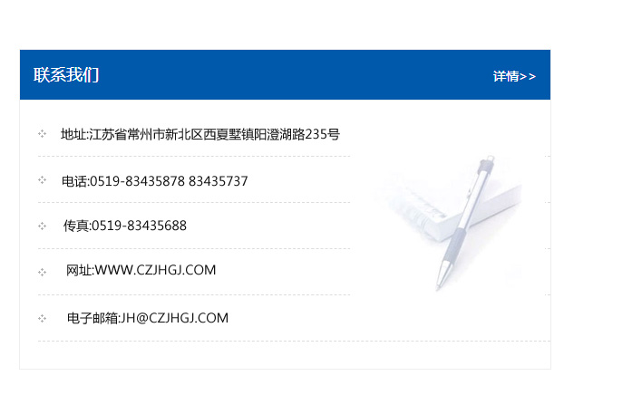 地址:常州市新北區友邦商務大廈1幢16、17層  電話:0519-85101652  傳真:0519-85112595  郵編:213022  網址:www.cz-jiayue_cn.527wang.com  郵箱:xiajifengaa@163.com